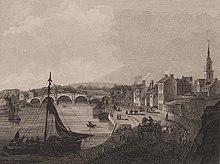 | "The capital of this country is Air, a sea-port, and as they tell us, was formerly a large city, had a good harbour, and a great trade: I must acknowledge to you, that tho' I believe it never was a city, yet it has certainly been a good town, and much bigger than it is now: At present like an old beauty, it shews the ruins of a good face; but is also apparently not only decay'd and declin'd, but decaying and declining every day, and from being the fifth town in Scotland, as the townsmen say, is now like a place so saken; the reason of its decay, is, the decay of its trade, so true is it, that commerce is the life of nations, of cities towns, harbours, and of the whole prosperity of a country: What the reason of the decay of trade here was, or when it first began to decay, is hard to determine; nor are the people free to tell, and, perhaps, do not know themselves. There is a good river here, and a handsome stone bridge of four arches."[4] |