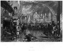The formation of the Kingdom of Great Britain through the Acts of Union 1707 was initially harmful to Ayr, due to the importance to its economy of the wine trade with France. The terms of the English Methuen Treaty of 1703, which favoured the importation of Portuguese and Spanish wines and was accompanied by punitive duties on French wines, were extended to Scotland.[14] However, the Union provided Ayr with significant trading opportunities with Britain's colonies around the world and resulted in improvements to the town's infrastructure, with Ayr's textile, wool, linen and shoemaking industries thriving as a result.[7] A small lighthouse was constructed on the River Ayr in 1712, followed by a quay in 1713. Repairs to the town's Harbour and High Tolbooth took place between 1724 and 1726, with funding provided by the Convention of Royal Burghs. Street lighting was installed around the town centre in 1747.[5] A sugar refinery at the harbour was in operation during the 1770s.[15]