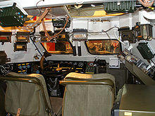 The BRDM-2 has a crew of four: a driver, a co-driver, a commander, and a gunner. It has two pairs of chain-driven belly wheels lowered by the driver, which allow trench crossing just like its predecessor, and a centralized tire pressure regulation system, which can be used to adjust the tire pressure of all four tires or individual tires while the vehicle is in motion to suit to the ground conditions.[1][2]