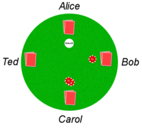 First betting round: Alice deals four cards face down to each player, beginning with Bob and ending with herself. Ted must act first because he is the first player after the big blind. He cannot check, since the $2 big blind plays as a bet, so he folds. Alice calls the $2. Bob adds an additional $1 to his $1 small blind to call the $2 total. Carol's blind is "live", so she has the option to raise here, but she checks instead, ending the first betting round. The pot now contains $6, $2 from each of three players.