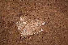 Home plate, formally designated home base in the rules, is the final base that a player must touch to score. Unlike the other bases, home plate is a five-sided slab of whitened rubber that is set at ground level. The dimensions of home plate are 17 inches (43 cm) across the front, 8.5 inches (22 cm) down each side, with a triangular rear of two sides of 12 inches (30 cm). The rear edges are at 45 degrees to the sides, making a point at the back.[1] The plate is white and surrounded by a black strip 3&fras1;4 inch (1.9 cm) in width. The plate sits entirely in "fair" territory, with the two rear edges aligned with the right and left field foul lines. The length and angle requirements for home plate mandate that it is not a regular pentagon; it is a 17 by 8.5 inches rectangle with an isosceles triangle of base 17 inches and equal sides of 12 inches attached to the back, in other words a square diamond 12" on a side situated within the vertex of the foul lines, with the forward triangular half subtended within a rectangle.
