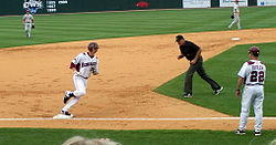 Beginning halfway between home and first base, and ending at first base, there is a second chalk line to the right of the foul line. This second line and the part of the foul line it runs parallel to, form the running lane that defines the path in which a batter-runner must run as he is advancing to first base. Rule 6.05(k) of the Official Baseball Rules states that, if a batter-runner running to first base runs outside the running lane, and "in doing so" interferes with the fielder taking the throw at first, then the batter-runner is automatically out. First base itself is not located in the running lane, but Rule 6.05 lets the batter-runner leave the running lane "by means of a step, stride or slide in the immediate vicinity of first base" to step on first base.[4]