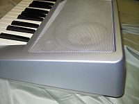 Some electronic keyboards use ported speakers to improve the bass response and sound performance. Pictured here is a Yamaha DGX-202.