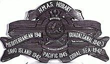 As warships do not carry regimental colours, battle honours are instead displayed on a battle honour board.[7] This is usually a solid wooden board (traditionally teak) mounted on the ship's superstructure, carved with the ship's badge and scrolls naming the ship and the associated honours, and either left completely unpainted, or with the lettering painted gold.[9] The size of the board and number of scrolls is dependent on the number of honours earned by a ship and her predecessors, although it is common for blank scrolls to be included in a design.[9] Other designs are also in use: these include plaques for the ship and honours mounted on a backing board, or the details painted onto a flat board.