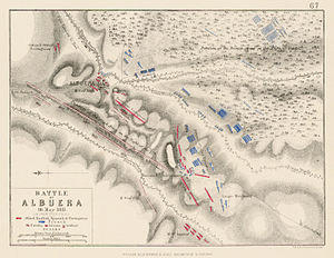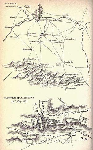 The Battle of Albuera (16 May 1811) was a battle during the Peninsular War. A mixed British, Spanish and Portuguese corps engaged elements of the French Armée du Midi (Army of the South) at the small Spanish village of Albuera, about 20 kilometres (12 mi) south of the frontier fortress-town of Badajoz, Spain.