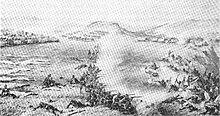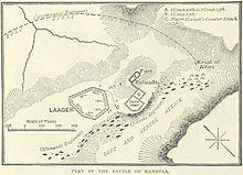 At 12:45 p.m. on 29 March 1879, the tents were struck, reserve ammunition was distributed, and the troops took up their battle stations.[7] As the troops moved to their posts they could see the Zulu right horn, circling north out of British artillery range before halting north-west of the camp. The left horn and centre of the impi continued westwards until they were due south of Kambula. At 1:30 p.m. Lieutenant-Colonel Redvers Henry Buller was ordered with his mounted troops, to sting the right horn into premature attack. The men rode out to within range of the massed Zulus, fired a volley and raced back, closely followed by a great wave of 11,000 Zulu warriors shouting "Don't run away Johnnie! We want to speak to you".[9] As soon as the horsemen had reached Kambula and cleared the field of fire, the British infantry opened fire with support from their four 7-pounders firing shell, which had been firing over the heads of the horsemen and then when the Zulus got closer, engaging them with case (canister shot). A small number of Zulus managed to burst into the laager and were repelled with bayonets, while the bulk of the advance was held at bay by the steady British volley fire and artillery. Some of the Zulu force swung right to come in against the western side of the laager but were met with equally effective volley-fire. At about 2:15 p.m. the Nkobamakosi of right horn drew back to the north-east.[10]