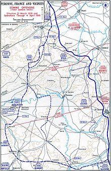 On 23 March the German forces broke through to the village of Ham, and the 3rd Cavalry Division, commanded by Brigadier-General A.E.W. Harman, was ordered to the village of Bouchoire along with 200 men from the Canadian Cavalry Brigade. As the German advance moved onwards, the newly formed force fought actions at Cugny, Villeselve, La Neuville-en-Beine and Beaumont-en-Beine. On 26 March, the enemy broke through the lines, and Allied forces began a withdrawal with the force under Harman conducting rearguard actions. By this time, the German advance had penetrated up to 45 kilometres (28 mi) into Allied positions; however, by this time supply lines were beginning to be stretched, and Ludendorff diverted his objectives and thus lost some momentum of his attack while he attempted to drive a wedge through between British and French forces.