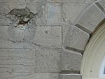 The church was burnt and destroyed, except for the facade, which still exists. The rest of the church has been rebuilt. The facade still shows the marks of British cannon impacts.