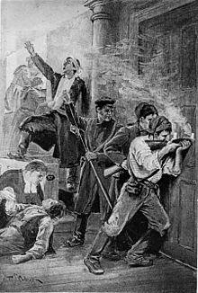At the battle site, Colborne placed his troops around the village and had his soldiers advance systematically to tighten the vice on the defenders. Towards noon, he ordered the artillery to open fire on the centre of the village and then to advance up the main street and break down the doors of the church, where many Patriotes had taken refuge. Two companies of the 1st Regiment of Foot were able to take the rectory nearby, and they set it on fire so that the smoke would make it difficult for those defending the church to see. The grenadiers of the 1st Regiment of Foot then took the manor and set it on fire as well. They were then able to enter the church through the vestry, which they also torched prior to withdrawing under the fire of the Patriotes in the balcony. Caught in the burning church, the Patriotes tried to get out by jumping from the windows, where Jean-Olivier Chénier finally attempted an escape. However, he was swiftly killed. The government forces fired at the rebels as they jumped out the windows to escape the fire. At this point the government troops made a final assault in a merciless struggle. This disastrous battle for the Patriotes lasted at least 4 hours; 70 Patriotes were killed, against only three government soldiers.[1]
