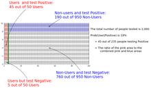 The 1,000 people thus yields 235 positive tests, of which only 45 are genuine drug users, about 19%. See Figure 1 for an illustration using a frequency box, and note how small the pink area of true positives is compared to the blue area of false positives.