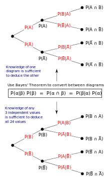 The role of Bayes' theorem is best visualized with tree diagrams such as Figure 3. The two diagrams partition the same outcomes by A and B in opposite orders, to obtain the inverse probabilities. Bayes' theorem links the different partitionings.