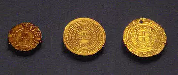 The original "bezants" were the gold coins produced by the government of the Byzantine Empire, first the nomisma and from the 11th century the hyperpyron. Later, the term was used to cover the gold dinars produced by Islamic governments. In turn, the gold coins minted in the Kingdom of Jerusalem and County of Tripoli were termed "Saracen bezants", since they were modelled on the gold dinar. A completely different electrum coin based on Byzantine trachea was minted in the Kingdom of Cyprus and called the "white bezant".[1]