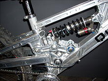 Another common seat stay variant is the wishbone, single seat stay, or mono stay,[25] which joins the stays together just above the rear wheel into a monotube that is joined to the seat tube. A wishbone design adds vertical rigidity without increasing lateral stiffness, generally an undesirable trait for bicycles with unsuspended rear wheels.[26] The wishbone design is most appropriate when used as part of a rear triangle subframe on a bicycle with independent rear suspension.