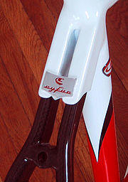 Combining different materials can provide the desired stiffness, compliance, or damping in different areas better than can be accomplished with a single material. The combined materials are usually carbon fiber and a metal, either steel, aluminum, or titanium. One implementation of this approach includes a metal down tube and chain stays with carbon top tube, seat tube, and seat stays.[64] Another is a metal main triangle and chain stays with just carbon seat stays.[65] Carbon forks have become very common on racing bicycles of all frame materials.[66]