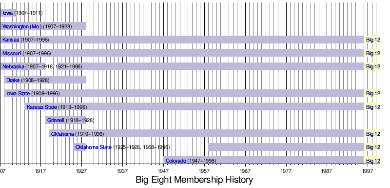 | Former names | Missouri Valley Intercollegiate Athletic Association (1907–1964) Big Six Conference (1928–1948, unofficial) Big Seven Conference (1948–1957, unofficial) Big Eight Conference (1957–1964, unofficial) |