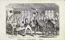 Birching featured in the French Revolution. One leader of the revolution, Anne-Josèphe Théroigne de Méricourt, went mad, ending her days in an asylum after a public birching. On 31 May 1793 the Jacobin women seized her, stripped her naked, and flogged her on the bare bottom in the public garden of the Tuileries.[6] Judicial birching in 20th-century Britain was used much more often as a fairly minor punishment for male juveniles, typically for petty larceny, rather than as a serious penalty for adult men. This was applied to boys aged up to 14 in England and Wales, and up to 16 in Scotland. In this juvenile version, the birch was much lighter and smaller, and the birch was administered privately by a policeman, usually immediately after the magistrate's court hearing, either in a room in the court building or at the nearest police station.