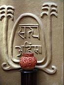 Outside the house stands a pillar that contains a swastika symbol. The prominence of the pillar means that it has been used as a visual example of the way the ethical meaning of the swastika symbol has changed in the West in the 20th century.[6] The same pillar also contains the Sanskrit symbol for the meditation sound, Om.