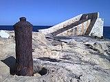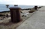 In the maritime contexts in which the term originates, a bollard is either a wooden or iron post found as a deck-fitting on a ship or boat, and used to secure ropes for towing, mooring and other purposes; or its counterpart on land, a short wooden, iron or stone post on a quayside to which craft can be moored. The Sailor's Word-Book of 1867 defines a bollard in a more specific context as "a thick piece of wood on the head of a whale-boat, round which the harpooner gives the line a turn, in order to veer it steadily, and check the animal's velocity".[1][6] Bollards on ships, when arranged in pairs, may also be referred to as "bitts".[7][8]