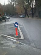 Traffic bollards are used to highlight traffic islands. They are primarily used at intersections within the splitter islands (a raised or painted area on the approach of a roundabout used to separate entering from exiting traffic, deflect and slow entering traffic, and provide a stopping place for pedestrians crossing the road in two stages)[13] and at the ends of pedestrian refuge islands, typically located at mid-block pedestrian crosswalks.