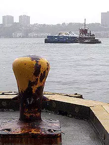Mooring bollards, such as this one in the Hudson River, were the first type of bollard: the use of the term has since expanded.