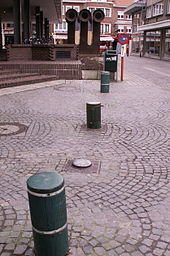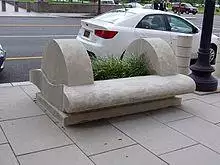 Permanent bollards can be used for traffic-control or terrorist prevention purposes.[10] They may be mounted near enough to each other that they block ordinary cars/trucks, for instance, but spaced widely enough to permit special-purpose vehicles, bicycles, and pedestrians to pass through. Bollards may also be used to enclose car-free zones. Bollards and other street furniture can also be used to control overspill parking onto sidewalks and verges.[11]