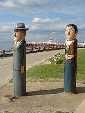 In Geelong, Victoria, Australia, decorative bollards, sculpted and painted by Jan Mitchell, are placed around the city to enhance the landscape as a form of outdoor public sculpture. Usually they are made of timber, minimally modified from the traditionally cylindrical, wooden, maritime bollard shape, but brightly painted to resemble human figures. Such figures – which may be historical or contemporary, particular or generic – are sited singly or in clusters along the waterfront and in other areas where people gather. Decorative bollards have become a well-known feature of the city of Geelong and reflect its history as a major Australian port.[43]