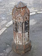 Wooden posts were used for basic traffic management from at least the beginning of the 18th century. An early well-documented case is that of the "two oak-posts" set up next to the medieval Eleanor cross at Waltham Cross, Hertfordshire, in 1721, at the expense of the Society of Antiquaries of London, "to secure Waltham Cross from injury by Carriages".[5] Similar posts can be seen in many historic paintings and engravings.