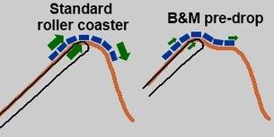 Many Bolliger & Mabillard coasters feature an element known as a "pre-drop", a short drop after the top of the lift hill and before the start of the first drop, designed to reduce stress on the lift chain. The flat section between the pre-drop and the first drop serves as a shelf to support the weight of the train, reducing related stresses on the chain. On most coasters without a pre-drop, the weight of the train tends to pull on the lift chain as it begins its descent because the latter half of the train is still being lifted by the chain. Pre-drops have not been used on the company's Dive or Flying coasters, or on hyper coasters built after 1999.[26][27] OzIris at Parc Astérix was the first B&M inverted roller coaster that does not feature a pre-drop.[28] Ever since, no coaster built by B&M has featured a pre-drop[29][30] because the chain accelerates on newer coasters of B&M after the train passes the crest to acquire the same speed as the train when it is being taken over by gravity.[31]