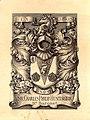 In many ways the consideration of the English bookplate, in its numerous styles, from the Tudor period to the late Victorian period, is particularly interesting. In all its varieties it reflects with great fidelity the prevailing taste in decorative art at different epochs—as bookplates do in all countries. In 2010 John Blatchly asked whether the hand-painted armorial device attached to a folio of the first volume of Quatuor concilium generalium belonging to Cardinal Wolsey should be regarded as the first English bookplate.[15] It is made of paper and was pasted onto the front pastedown of the book. However it was not printed. In this respect it is the only known example. The librarian David Pearson has argued that a plausible case can be made for regarding this as a kind of bookplate.[16]