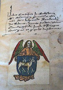 However, in their modern form, they evolved from simple inscriptions in books which were common in Europe in the Middle Ages, when various other forms of "librarianship" became widespread (such as the use of class-marks, call numbers, or shelfmarks). The earliest known examples of printed bookplates are German, and date from the 15th century. One of the best known is a small hand-coloured woodcut representing a shield of arms supported by an angel, which was pasted into books presented to the Carthusian monastery of Buxheim by Brother Hildebrand Brandenburg of Biberach, about the year 1480—the date being fixed by that of the recorded gift. The woodcut, in imitation of similar devices in old manuscripts, is hand-painted. An example of this bookplate can be found in the Farber Archives of Brandeis University.[11] In France the most ancient ex-libris as yet discovered is that of one Jean Bertaud de la Tour-Blanche, the date of which is 1529. Holland comes next with the plate of Anna van der Aa, in 1597; then Italy with one attributed to the year 1622.[12] The earliest known American example is the plain printed label of Stephen Daye, the Massachusetts printer of the Bay Psalm Book, 1642.[13]