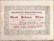Some bookplates were issued by institutions, often religious ones, which awarded books to individuals to recognise academic performance, good behaviour and the like. These would be inscribed with the name of the individual by hand. Such plates could be very elaborate, or very simple in their design, reflecting the character of the awarding institution.[19]