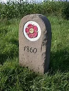 A boundary marker, border marker, boundary stone, or border stone is a robust physical marker that identifies the start of a land boundary or the change in a boundary, especially a change in direction of a boundary.[1] There are several other types of named border markers, known as boundary trees,[2][3][4][5] pillars, monuments, obelisks, and corners.[1] Border markers can also be markers through which a border line runs in a straight line to determine that border.[1] They can also be the markers from which a border marker has been fixed.[1]