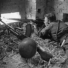 Generally, the Bren was fired from the prone position using the attached bipod.[13] On occasion, a Bren gunner would use his weapon on the move supported by a sling, much like an automatic rifle, and from standing or kneeling positions. Using the sling, Australian soldiers regularly fired the Bren from the hip, for instance in the marching fire tactic, a form of suppressive fire moving forward in assault. A Victoria Cross was awarded to Private Bruce Kingsbury for such use at Isurava, New Guinea, in 1942, during the Australians' fighting retreat from Kokoda.