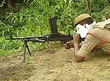 In the 1950s, many Bren guns were re-barrelled to accept the 7.62×51mm NATO cartridge and modified to feed from the magazine for the L1 (Commonwealth version of the FN FAL) rifle as the L4 light machine gun. It was replaced in the British Army as the section LMG by the L7 general-purpose machine gun (GPMG), a heavier belt-fed weapon. This was supplemented in the 1980s by the L86 Light Support Weapon firing the 5.56×45mm NATO round, leaving the Bren gun in use only as a pintle mount on some vehicles. The Bren gun was manufactured by Indian Ordnance Factories as the "Gun Machine 7.62mm 1B"[3] before it was discontinued in 2012.[4]