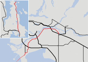 On the Mainland, Highway 17 is known as the South Fraser Perimeter Road (SFPR), a component of the British Columbia Ministry of Transportation's Gateway Program. It is a four-lane expressway with a speed limit of 80 km/h (50 mph) over most of its length, connecting the Tsawwassen Ferry Terminal and Highway 99 in Delta to Highway 1 at 176th Street in Surrey, and providing access to all five of the major Fraser River crossings in Metro Vancouver.[5] The mainland section is notable for its extensive use of noise walls, split level construction through Delta and use in some urban sections of so-called Quiet Pavement to reduce traffic noise.[6]