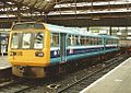 Starting in the early 1990s, every member of the class was mechanically upgraded due to the original parts starting to fail. Accordingly, each car was refitted with a more powerful Cummins L10 series engine – 230 bhp per car, which equals 460 bhp (340 kW) per twin-car unit – and Voith T211r two-stage hydraulic transmission, starting with a torque converter which switches to fluid coupling drive once the unit is up to 45 mph (72 km/h).[19] All units were fitted with new Voith transmission by late 1991 and Cummins engines were fitted between 1993 and 1996 to improve reliability. This change has proven to have been largely successful, although isolated failures have occurred, such as when a Northern Rail unit derailed en route from Blackpool to Liverpool in June 2009 due to a cardan shaft failure.[20]