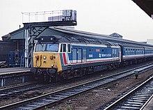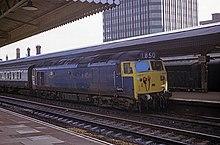 The class was built for working passenger services on the West Coast Main Line (WCML) north of Crewe, to Preston, Lancaster, Carlisle, Glasgow Central and Perth, occasionally reaching as far north as Aberdeen. Services south of Crewe would generally be worked by an electric locomotive, with the Class 50s taking over for the journeys that continued north.[10] Initially trains were hauled by a single locomotive, but from May 1970 they were paired on 8 out of 34 locomotive diagrams covering Anglo-Scottish services north of Crewe,[11] allowing greatly accelerated timings to be applied (including a six-hour schedule for the "Royal Scot" London Euston-Glasgow Central and v.v. service). Once the electric service was introduced as far as Preston in 1973, this double-heading by Class 50s transferred there, although poor availability often resulted in single-heading with consequent delays. The ability to operate using multiple working had been part of the locomotive's initial design brief, but only two of the class had the facility from new, but with the introduction of the regular double headed duties, this facility was fitted to the whole class.[10]