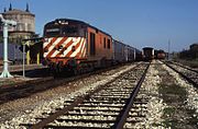 In 1987, consideration was given to using the class on freight trains. To this end, 50049 "Defiance" was renumbered to 50149, equipped with modified Class 37, lower-geared bogies and outshopped in the new trainload grey livery with Railfreight General decals. It was based at Plymouth Laira depot, and tested on local china clay trains in Cornwall as well as heavy stone trains to London from Devon quarries.[10] The project was, however, not an outstanding success and by 1989 the locomotive had been returned to its original identity. Ironically, the electronic anti-wheelslip equipment, with which the entire class had originally been built and which would have been key to the success of this experiment, had been removed during the refurbishment process.[10]