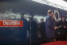 By 1992, just eight locomotives remained in service, these being 50007/008/015/029/030/033/046/050. Several of these locomotives were specially repainted to commemorate the run-down of the fleet. The first-built locomotive, 50050 Fearless was renumbered D400 and painted in its original BR Blue livery. Two other locomotives, 50008 Thunderer and 50015 Valiant were also repainted, the former in a variation of BR Blue (the same as 50019 had previously carried), and the latter in "Dutch" civil-engineers grey/yellow livery. Of the final eight locomotives, three were retained until 1994 for use on special railtours, these being 50007 Sir Edward Elgar, 50033 Glorious and 50050 Fearless. 50007 was returned to working order using parts from 50046, which surrendered its recently overhauled power unit and bogies. By this time, 50050 had been repainted into Large Logo livery and 50007 also received a repaint into GWR green as the 1985 paint was wearing very thin. The final railtours operated in March 1994, during one of which 50033 was delivered for preservation at the National Railway Museum.[15] The final railtour operated with 50007 and 50050 from London Waterloo to Penzance and returning to London Paddington. Both locomotives were later preserved.