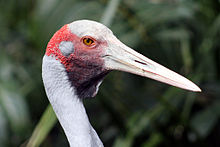 The brolga is a common, gregarious wetland bird species of tropical and south-eastern Australia and New Guinea. It is a tall, upright bird with a small head, long beak, slender neck, and long legs. Its plumage is mainly grey, with black wing tips, and it has an orange-red band of colour on its head. The brolga's courting dance is similar to that of other cranes, and is well recognized by Australians. The nest is built of wetland vegetation, either on an elevated piece of land, or floating on shallow water in marshland, and usually two eggs are laid. Incubation takes 32 days and the newly hatched young are precocial. The adult diet is omnivorous and includes plant matter, invertebrates, and small vertebrates.[4]