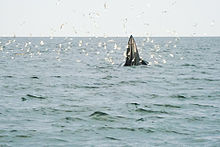 In the Gulf of California, they mainly feed on Pacific sardine (Sardinops sagax) and Pacific thread herring (Opisthonema libertate) (about 88%), but also feed on euphausiids (mostly Nyctiphanes simplex, 11%). They have also been observed feeding on pelagic red crabs (Pleuroncodes planipes) off southern Baja California.[19] In the Coral Sea, the South Pacific, and the Indian Ocean, they appear to mainly feed on euphausiids, while off Brazil, they have been observed feeding on sardines. Individuals caught off Western Australia were found with anchovies (E. australis) in their stomachs (though these individuals may refer to Omura's whale).[20] Bryde's whales use several feeding methods, including skimming the surface, lunging, and bubble nets especially within Gulf of Tosa.[6][21][22]