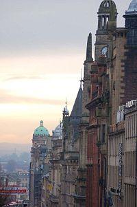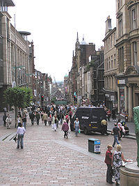 Buchanan Street is one of the main shopping thoroughfares in Glasgow, the largest city in Scotland. It forms the central stretch of Glasgow's famous shopping district with a generally more upmarket range of shops than the neighbouring streets: Argyle Street, and Sauchiehall Street.
