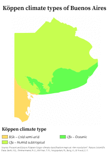 As part of The Pampas, the weather of the province is strongly influenced by the ocean, with hot summers and temperate winters. Humidity is high and precipitation is abundant and distributed over the year. The Western and Southwestern regions are drier.