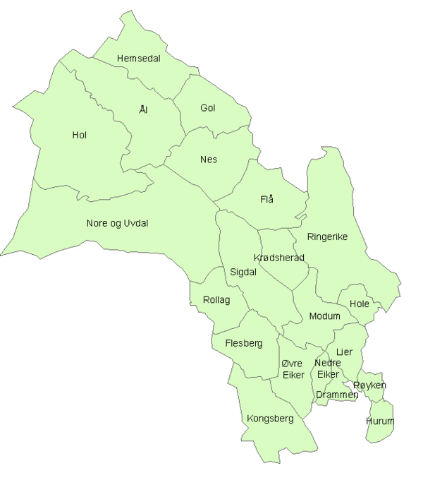 Hallingdal consisted of Flå, Nes, Gol, Hemsedal, Ål and Hol.[6] Numedal consisted of Flesberg, Rollag and Nore og Uvdal.[7] Ringerike consisted of Hole, Krødsherad, Modum, Ringerike and Sigdal. Western Vingulmark consisted of Hurum and Røyken.[8][9] Lower Buskerud consisted of Drammen, Hurum, Kongsberg, Lier, Nedre Eiker, Røyken and Øvre Eiker. The district was merged from parts that belonged to Vestfold and Vingulmark.[10]