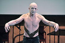 Starting in the early 1980s, butoh experienced a renaissance as butoh groups began performing outside Japan for the first time; at this time the style was marked by "full body paint (white or dark or gold), near or complete nudity, shaved heads, grotesque costumes, clawed hands, rolled-up eyes and mouths opened in silent screams."[7][8] Sankai Juku was a touring butoh group; during one performance by Sankai Juku, in which the performers hung upside down from ropes from a tall building in Seattle, one of the ropes broke, resulting in the death of a performer. The footage was played on national news, and butoh became more widely known in America through the tragedy.[9] A PBS documentary of a butoh performance in a cave without an audience further broadened awareness of butoh in America.
