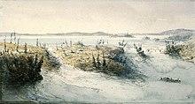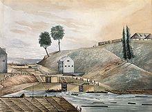 Corktown, not a town at all, was a series of shanties along the "Deep Cut" section of the Rideau Canal in Ottawa which existed during its construction and were erected by some of its Irish labourers.[18] Many of the workers came penniless from County Cork in Ireland, giving it its name. The settlement along both sides of the canal was allowed by Colonel By due to their desperate poverty and inability to pay rent.[19] These men, separated from the others, had done some of the hard labour required of the canal's construction. They built turf or log shanties along the muddy bank, and possibly without sanction extended the settlement as far as through the Lower Town swamp and the banks of the Rideau River.[20] Eventually women and children moved to the area living among the approximately 150 houses built by 1829.[18] Corktown disappeared shortly after the completion of the canal, which was under construction between 1826 and 1832.[21][4]