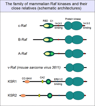 - ^ Emuss V, Garnett M, Mason C, Marais R (November 2005). "Mutations of C-RAF are rare in human cancer because C-RAF has a low basal kinase activity compared with B-RAF". Cancer Res. 65 (21): 9719–26. doi:10.1158/0008-5472.CAN-05-1683. PMID 16266992.