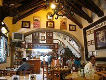 Cantina was one of the foreign words that entered in from Renaissance Italy. During the 16th century, the Spanish Empire included large holdings in Italy.[3] Luis de Bávia wrote in his Tercera y Cuarta Parte de la Historia Pontifical y Católica (1621): "Perdiéndose en las cantinas y lugares baxos [sic] gran número de mercaderías..." ("Losing itself in the cantinas and places of ill repute a large quantity of merchandise...").[4]