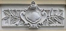 Cartouche with a monogram of ZNS, with Neo-Renaissance ornaments, in a Venetian window-like relief, on a house, Bucharest