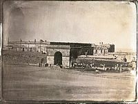 Under the direction of the English architect, Edward Taylor, the New Customs House was built in 1855 back to back with the rear walls of the Fort, facing the river. It is the first public building of great size built by the young mercantile State of Buenos Aires; its semicircular shape had five floors for depots and fifty one storage rooms with arched ceilings, surrounded by loggias. From the central tower at the top of which there was a clock and a beacon, stretched out a 300 m pier providing wharfaging for ships of greater draught to cast their anchors. Via two side ramps carts, loaded with goods, accessed the manoeuvring dock. It was used for almost forty years and it was demolished down to the first floor by the Madero Port project and its foundations are buried under what is today Colón Park.[2]